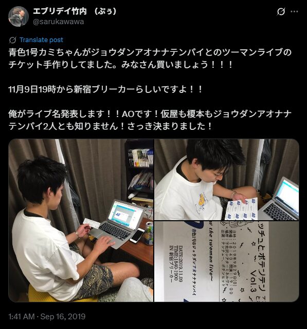 青色1号のメンバーは3人で(カミムラさん、榎本淳さん、仮屋想さん)です
