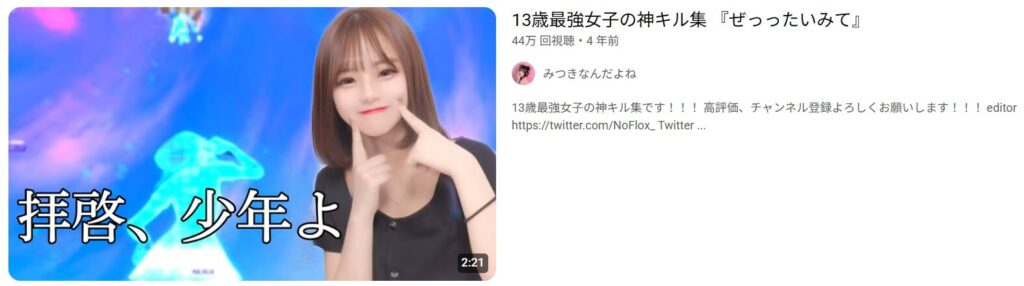 フォートナイトのゲームで13歳女子の神キル集をYouTubeで上げています。