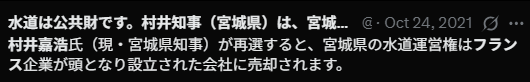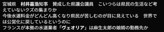| 水道民営化・外国資本売り渡し | 水道事業を民営化し、外国資本に利権を渡したとの陰謀論。JICAスキャンダルとのつながりも。 | 根拠薄弱。水道民営化の議論は全国的だが、宮城県で具体的な不正は確認なし。JICA関連は推測ベースの噂。 |