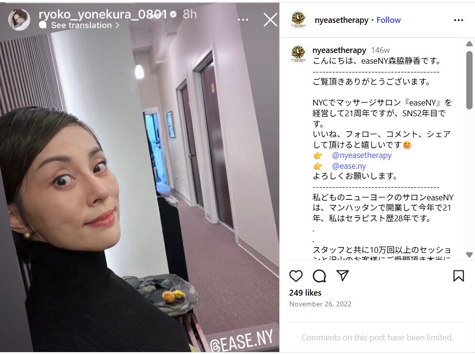 米倉涼子さんは2022年にNYにあるマッサージ店に通っている画像が見つかりました。